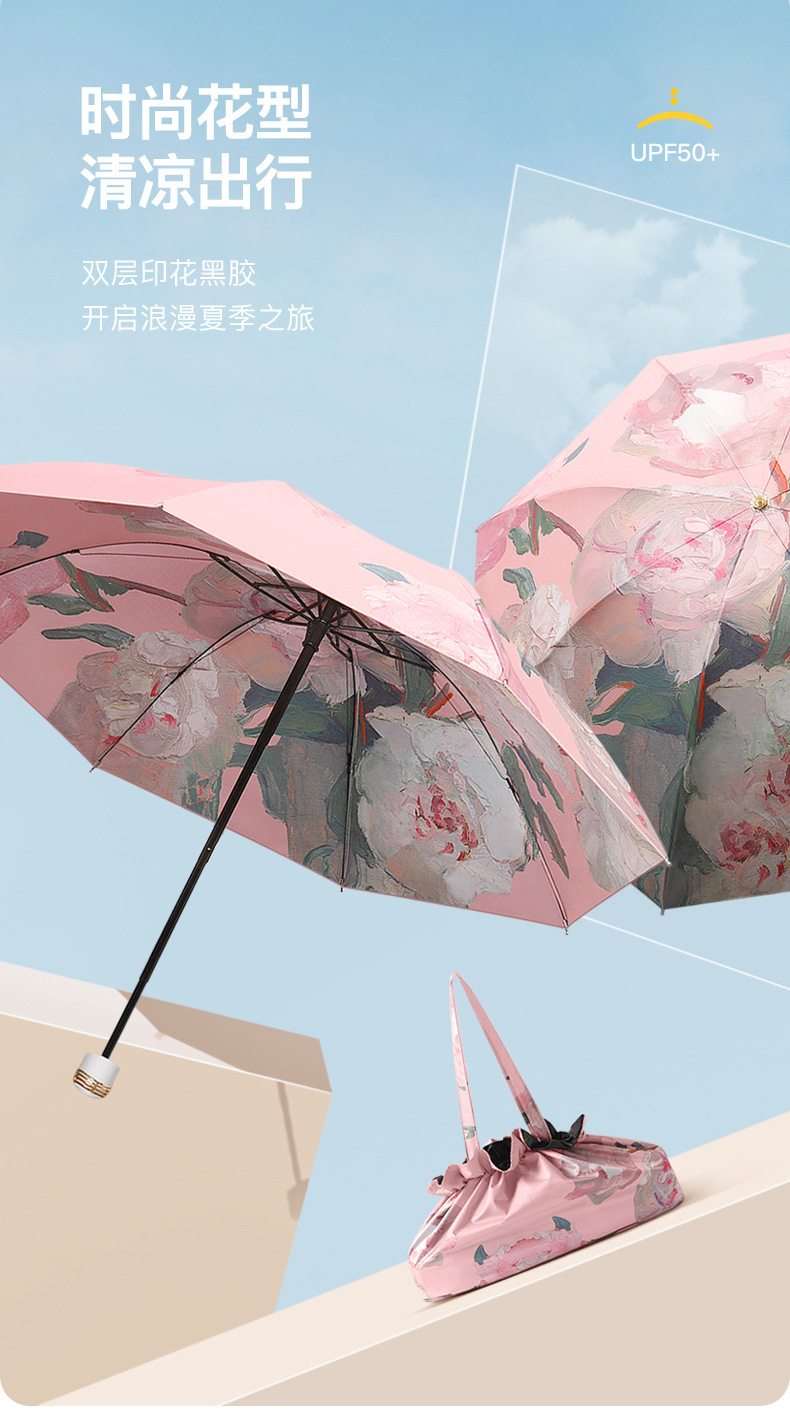 新款手提袋彩胶印花双层伞:伞布材质为黑胶布,过胶为彩胶,密度190T,伞骨材质为铁加纤维,中棒材质为铁,伞柄材质为abs,8骨设计,手动打开和收伞,款式为三折伞。有绿蔷薇,香雪兰,白玫瑰,粉芍药等彩胶花香满园系列,以及黄色、灰绿等流光花语系列可供选择。该伞具有防晒防紫外线功能,毛重370克,造型为双层伞。